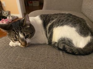 He’s a chunky white cat with grey spots and green eyes with tan under his belly