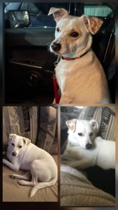 White mixed breed male. 7years old. 40lbs wearing a small chain collar