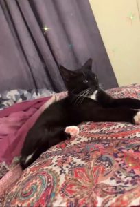 black cat with white patches of fur tuxedo cat. domesticated short hair. 10 lbs