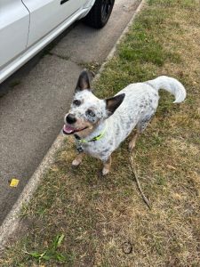 Small Australian Cattle Dog with one blue eye one brown. No collar on. White with dark grey spots and reddish legs.