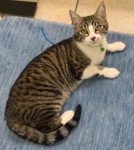 Breed: Tabby Color: gray/black with a white