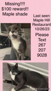 He is a small boy maybe 7 pounds. He can be sweet but also skittish. He is primarily gray with white. A tuxedo with a half mustache. He’s fixed.