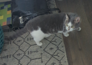 She is skittish and timid. She may not approach you. She has a smudge-looking spot on her nose.