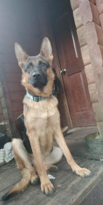 Female German shepherd wearing bright blue collar with white flowers. Shy and skittish of strangers and may bark but not aggressive.