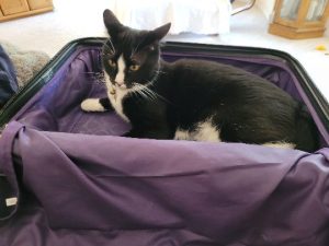 Black with white nose, chin, chest and tummy. Black collar reflective name tag and bell chipped.