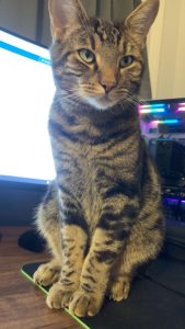 He is a tabby cat with thick black markings. He knows his name “Kiwi” and will come to you. He loves treats and is extremely friendly.