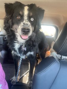 Black body with white chest and has a white tipped tail and white paws. Spotted white and black face.