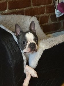Monkey is a 13 pound 2 year old miniature Boston Terrier. He is a little skiddish, and he howls at the top of his lungs when left alone.