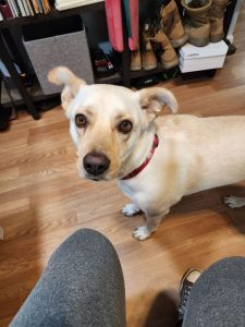 Yellow Lab/Mix – 3yo / 35 lbs. Missouri rabies tag, blue tic collar, marble dog collar.