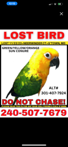 Sun Conure Parrot, head is yellow, feathers are green and orange
