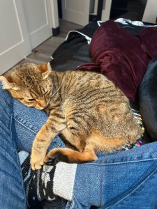 Male cat. Bobbed tail and curved ears. Bobcat markings. Name is Luca, approx 8 lbs. Has a black collar with a purple heart tag.