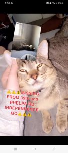 He is a medium sized cat with a black collar with skull and bones. He has a broken front left tooth