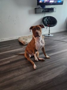 Name is Lola she has a pink collar with shiny and pointy rhinestones