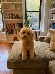 Curly light blonde hair, about 25 pounds. Will be wearing a collar and a harness.