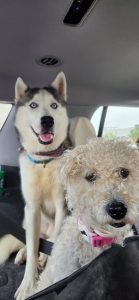 Rocky and Lulu are both really friendly, Rocky the husky is a big dog with balck and white fur and blue eyes. And Lulu is a smallmixed poodle with white fur and brown eyes.
