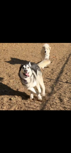 Zeus is a large, black and white not-neutered Husky, about 85lbs, with a purple nylon collar and dragging a black nylon leash. He responds best to “come” “come here”, but you can try his name too. He may run if chased but will come if you’re friendly. Try to coax him with food (even if just pretend) until you can grab his leash. no tags or microchips yet.