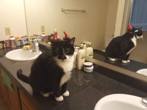 Black and white fur. All white paws. Stripe on the head. White on the belly. Green or yellow eyes.