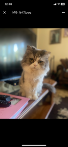 Wasabi is white with gray markings down his back and on his head. He has a lot of fur which may be dirty from being out.He’s usually very friendly.