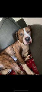 Light brown eyes and he is brindle with white stomach and the white goes around his neck like a collar and his nose is white along the snout and he has droopy ears and he’s very kind and friendly. He is not neutered.