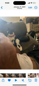 She has a very noticeable scar inside of her right eye and a red collar on with a bell on it.