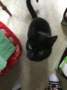 Black cat with a slim build, very long tail, and a very small scattering of white fur at his chest.