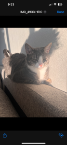 Description: smaller grey tabby with small head and big eyes. has a couple brown spots on his nose. yellow green eyes. very awkward and skittish. very sweet