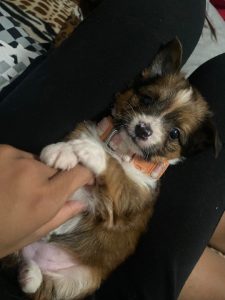 Very small, is mostly brown with white coat under her belly, has a white and pink checkered calar on with a hint of orange *no tag