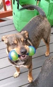 Delyla is a brown female Texas Heeler. She has ticking on her chest and paws.