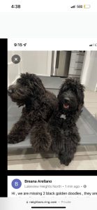 My 2 black short haired goldendoodles are missing, they weigh approz 80 lbs and are almost 2 years old. They are brothers, one is slightly bigger than the other. One has a blue collar and the other has a yellow fi collar with tracking devices. Very sweet.