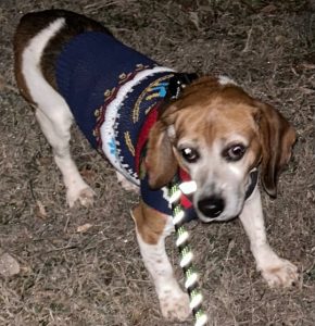 Has on blue Christmas sweater and red harness.30lbs not neutered fully vaccinated very skittish and scared