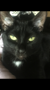 She is all black the diamond shape of white on her chest and a little bit of white between her back legs she is also spayed.