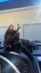 Evie is wearing a blue star jingle bell collar, she is a loving cat and will probably walk up to you. she’s about 6-8 lbs, she’s a tortoiseshell; black, brown and caramel. she has bright golden eyes.