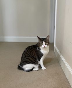 Domestic short hair with black and grey stripped fur on the back. White stomach and short tail.