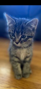 Breed: Tabby shorthair Color: Grey and black