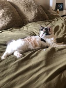 Female white and fluffy cat with a bobtail. Super friendly and sweet