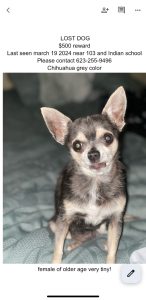 Older female very tiny chihuahua with foggy eyes. Grayish brown coat. Tongue sticks out