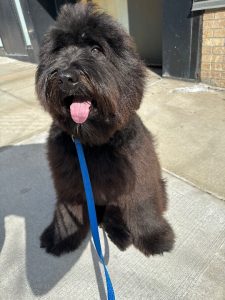 Fluffy black/brown dog, looks a bit like a GoldenDoodle. White hair at chin. 60 lbs.
