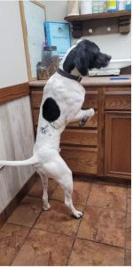 Black and white, all muscle, friendly. Wearing brown collar with name plate and shock collar.