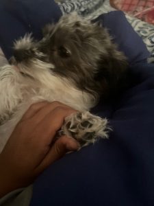 Small black and white Maltipoo. she’s a year old, friendly dog that loves to jump high to receive attention.. she doesn’t bite, very sweet. colored like a cow.