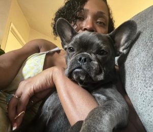 A gray, 9 month old female frenchie. She has distinctive underbite and a white stripe on her chest