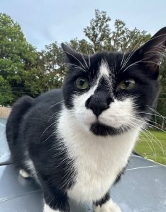 Black & white shorthair neutered male. Green eyes. Very long and slim. Weighs about 13lbs. Long fangs & long white whiskers around his mouth and nose. His left eye looks more gold than green in certain lighting. Very loving and friendly. Quiet raspy meow.
