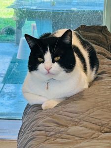 Has a black collar, there is a moon charm on collar. Loki weighs about 11lbs