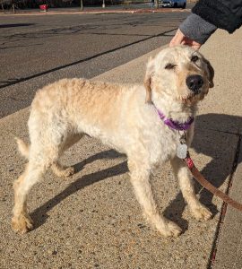 Daisy is 50lbs golden labradoodle. Tan with purple collar