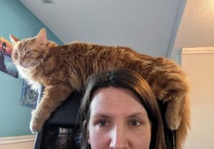 Orange tabby, very fluffy tail. Friendly and cuddly, but not an outdoor cat, so not sure how he's handling the outdoors.