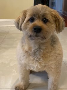 11 year old shihtzhu-pomeranian mix with folded small ears and curly tail. Is brown with dark and light brown fur patches.