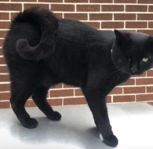 One eye (it’s half cloudy) curly tail dark pink flea collar and orange nylon collar with round silver bell black fur short hair
