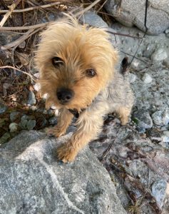 Male, brown & gray Yorkie with a worn out flea collar his fur is currently longer and messier than shown in image, he has a stubby tail.