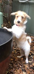 Scruffy little terrier, white with brown markings. About 11pounds.