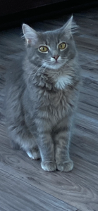 Small grey with yellow eyes dont chace her here eyes are greenish and a bit yellow she has white on her chest