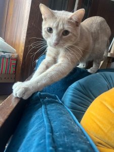 Orange short hair tabby, his name is rupi, but he may also respond to poopy and rupert. He has a little scar on the top of his nose. He tends to hide from new people, so he may not let you approach.